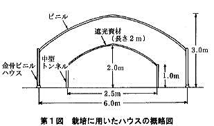 1994年6月14日に‘青帝’を播種し,7月5日に第1図に示すように間口6m,高さ3mの鉄骨ビニルハウス内に,間口2.5m,高さ2mの中型トンネルを設置し,#610の白寒冷紗及び熱線カットフィルムを畝長2m,地表面からの高さ1mの所まで被覆する区及び対照区として無被覆区を設けた。各区とも白黒ダブルマルチを使用し白面を表にして被覆した畝に条間15cm,株間15cmで5条植えした。収穫は8月4日に行い,試験1と同様の調査を行った。