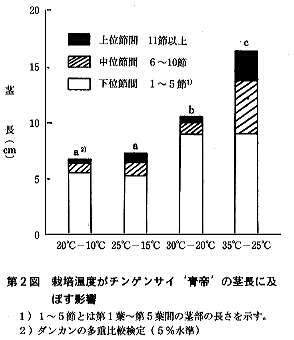 以上のように,株重,チップバーンの発生程度及び茎の節間伸長から,チンゲンサイの生育適温は25℃−15℃から20℃−10℃程度であると推察され,高温では生育が抑制されることが明らかとなった。