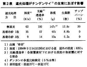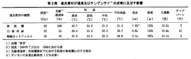 ビニルハウス内で遮光を行った場合の照度,温度及びチンゲンサイの生育を第3表に示した。白寒冷紗を被覆した場合の照度は53Klxで,無被覆の55%となった。また,無被覆に比べて最高気温は4.3℃低くなったが,最低気温は0.4℃の低下に止まり,平均気温は2.2℃,平均地温は1.6℃低かった。熱線カットフィルムを被覆した場合,照度は25Klxで無被覆の26%となった。また,白寒冷紗被覆に比べて,最高気温はさらに0.5℃,平均地温は0.7℃低くなったが,最低気温及び平均気温は変わらなかった。