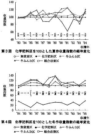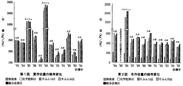 冬作の小麦収量についても試験開始5年後の1987年から牛ふん2t区及び総合改善区が化学肥料区に比べて高くなる傾向を示した。試験開始から9作の栽培を行った小麦の10a当たり収量の積算値は無窒素区1,149kg,化学肥料区3,773kg,牛ふん1t区3,842kg,牛ふん2t区4,103kg,総合改善区4,326kgであった。この収量を化学肥料区の値を100とする指数で示すと,無窒素区30,牛ふん1t区102,牛ふん2t区109,総合改善区115となり,化学肥料区に比べて無窒素区は極端に劣り,牛ふん1t区はほぼ同程度,牛ふん2t区及び総合改善区で高くなった。品質については大豆及び小麦ともに各年次間及び各処理間の差は小さかった。
