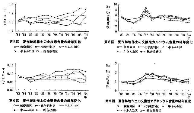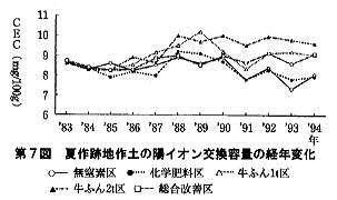 第7図に夏作跡地作士の陽イオン交換容量の経年変化を示した。陽イオン交換容量は牛ふん1t区,牛ふん2t区及び総合改善区では増加傾向で,化学肥料区及び無窒素区では減少傾向を示した。試験開始前の作土の陽イオン交換容量を100として1994年の値を指数で表すと無窒素区92,化学肥料区91,牛ふん1t区104,牛ふん2t区110,総合改善区105であった。