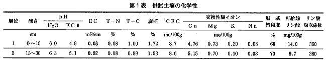 試験場所は福岡県農業総合試験場の畑ほ場(花こう岩質黄色土の上に厚さ30cmの畑地土壌を客入した中粗粒黄色土造成相)で,土壌条件は下層土に礫層が存在する,せき薄な砂壌土である。試験開始前の供試土壌の化学性は第1表に示したように,全窒素含量及び全炭素含量はそれぞれ0.08%,1.00%と低く,陽イオン交換容量は乾土100g当たり8.7meと小さい。