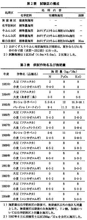 0.47%,K2O 0.92%,水分74%であった。総合改善区の深耕は堆肥施用の直前〜23日前に行い(1988年夏作カンショでは行わず,1989年の小麦では堆肥施用後に行った),おがくず入り牛ふん堆肥を施用(1983年及び1984年の大豆作では無施用)した後,基肥を施用し,耕耘後,播種もしくは定植を行った。栽培管理,施肥量は福岡県栽培基準に従った。 窒素の施肥効果が小さい大豆では1987年以降,すべての区で窒素肥料は施用していない。このため,無窒素区と化学肥料区は夏作の処理内容が全く同一となった(冬作の小麦では無窒素区以外は窒素肥料を施用している)。