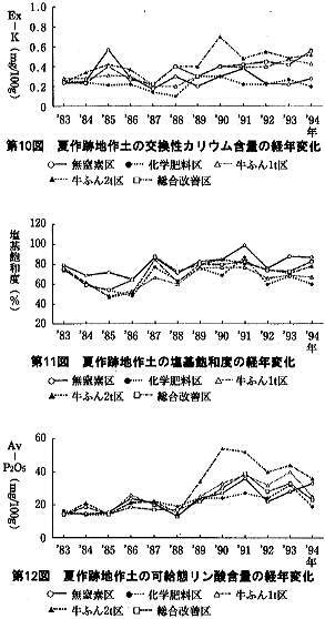 第10図に夏作跡地作土の交換性カリウム含量の経年変化を示した。交換性カリウム含量は牛ふん1t区及び牛ふん2t区,総合改善区でやや増加したが,無窒素区及び化学肥料区ではほぼ横ばい傾向であった。