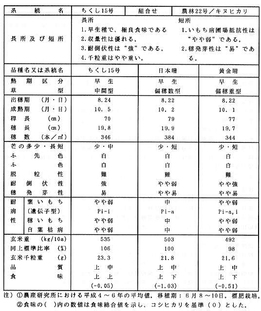 発表論文等:平成7年度水稲新品種決定に関する参考成績書「ちくし15号」