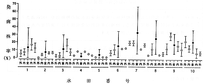 B発病株率40%以上の多発生圃場では発病株は万遍なく分布している(堀ら、1971)ので、畦畔付近などの部分調査で病株率の推定ができる。
