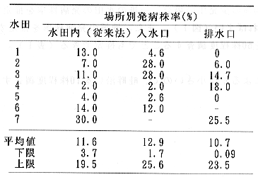 表1 コシヒカリ圃場の内部と入・排水口における紋枯病
