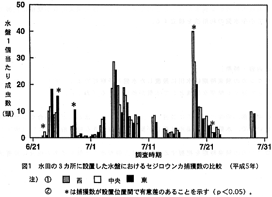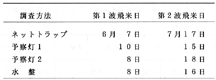 @セジロウンカの飛来時期は水田に設置した水盤と予察灯とよく一致し、セジロウンカの飛来時期を把握する簡便な予察器具として水盤が利用できる(表1)。