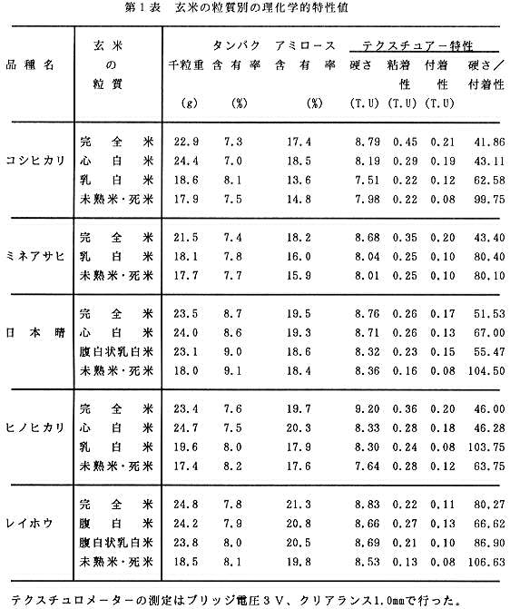 C炊飯米のテクスチャ−の硬さは腹白米、乳白米、腹白状乳白米、心白米および未熟米・死米では軟らかく、粘着性・付着性(良食味品種ほど粘着性・付着性は大きい)は乳白米、腹白状乳白米、心白米および未熟米・死米では小さい(表1)。