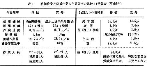 C組作業体系は、直播栽培では苗運搬作業が除かれることで、作業者を 1名少なくすることができる。大規模稲作経営における移植時の苗運搬作業は、移植作業の中でも労働負担の大きい作業である(表1)。
