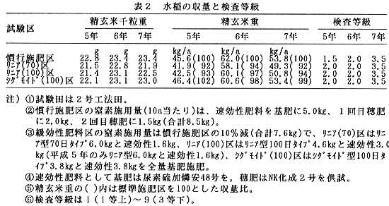 Bリニア型の緩効性肥料では、慣行施肥より精玄米千粒重が軽くなり、収量は慣行施肥より3%〜8%減収する(表2)。