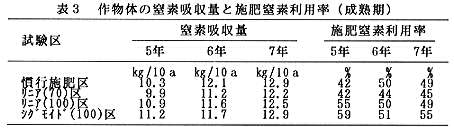 7.6s/10a)の利用率は慣行施肥より向上し、慣行施肥とほぼ同等の収量をあげることができる(表2、3)。