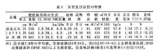 @「ほほえみ」の穂肥施用時及び成熟期の生育は「ミネアサヒ」に類似する。「日本晴」に比較して葉色はやや濃く、u当たり籾数はかなり多い。玄米窒素含有率及びアミロース含有率は低く、食味は優れる(表1)。