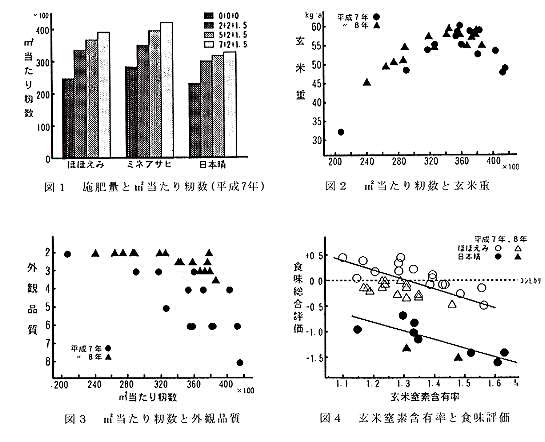 A多肥栽培や肥沃地では「日本晴」よりも籾数が増加しやすく、「ミネアサヒ」と同様に籾数過剰になり易い(図1、肥沃地のデータ省略)。