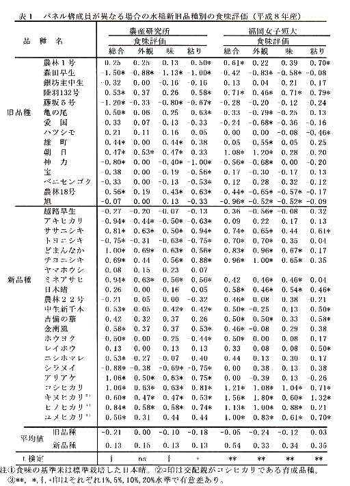 @水稲新旧品種の食味総合評価は、生産年(平成7年と平成8年、r=0.675***、n=31)およびパネル構成員(農産研究所と福岡女子短大、r=0.669***、n=37)が異なっても傾向は同じである(表1)。