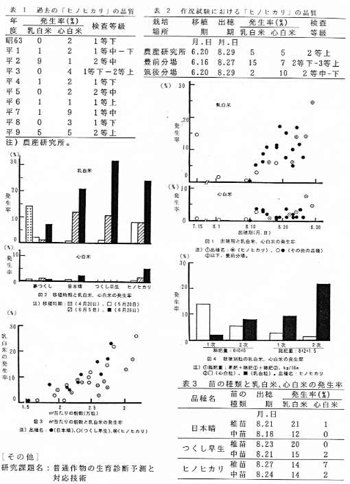 [背景・ねらい]福岡県における平成9年産水稲では、「ヒノヒカリ」を中心に乳白米、心白米が発生したため、上位等級比率が53%と、品質が低下した。そこで、本年度に発生した乳白米、心白米について、栽培地域、品種、移植時期、籾数レベルなどの面から、発生実態、要因を明らかにする。