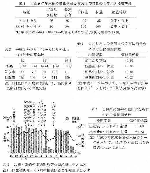 筑後地域における平成9年産水稲「ヒノヒカリ」の低収および心白米発生の要因