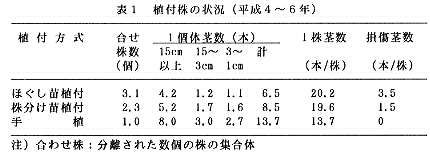 いぐさ栽培の低コスト・省力技術として機械移植栽培が普及している。現在普及している移植機は苗の処理方法として苗を株分けした状態で植付ける分割苗分離植付方式と苗をほぐした状態のみで植付ける未分割苗分離植付方式に大別される。そこで、この両者の生育特性を比較検討し、効率的な移植法を明らかにする。