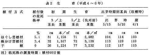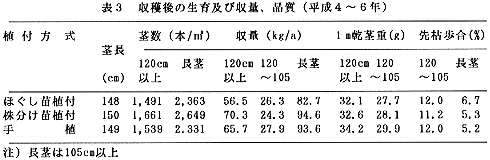 B分割苗分離植付方式は出芽後の生育が優り収穫時の「長茎」数が多く、良質いぐさである120cm以上の収量が多い。さらに、いぐさの品質も良好である(表2、表3)。