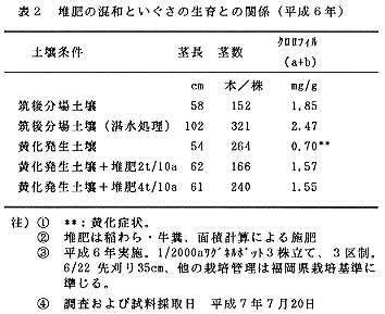A黄化症状が発生した株は、新芽の茎色が著しく薄くなり黄色になる。症状が進行すると株全体の黄化が認められる。黄化した茎のクロロフィル含量は正常茎の約半分であった。しかしながら症状の程度と茎中のマンガン・鉄含量に相関関係は認められない(表1)。