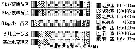 C植付苗を小苗にすると標準苗に比べて収穫時の老熟茎の割合が少ない。3月に強い地干し処理を行うと基準水管理に比べて老熟茎の割合が多い(省略1)。
