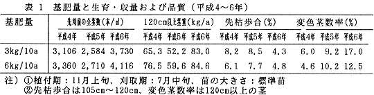 @基肥量を基準量(6kg/10a)の半量にすると先刈前までの生育は抑制できるが、茎中窒素濃度収量が低下するため先刈後の生育が劣り(データ省略)、収量が少なく先枯れや変色茎が多くなる傾向がみられる(表1)。