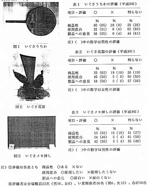 [要約] 反応染料を利用した新製品の開発を行い、民芸調のいぐさうちわ、インテリアのいぐさメモ挿しは男性からの評価が高く、装飾品のいぐさ花器は女性からの評価が高い。