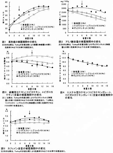 〔要約〕直接被覆によってかぶせ茶を栽培する場合、旨味成分であるアミノ酸含量が高く苦渋味を示すカテキン含量の低い高品質の生葉を生産するには、遮光率80%の資材を用いて2.5葉期から8日間以上被覆するとよい。主に摘採期の延長をはかる場合には、遮光率60%の資材を用いて2.5葉期から10日間以上被覆するとよい。