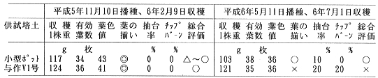 A培土は、春夏季には-の発の少ない小型ポット専用培土、秋冬季の栽培には生育の旺盛な与作V1号が適している(表2)。