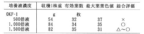 B培養液の濃度は、OKF-1使用では生育や収穫物の葉色等の面から1,000倍が適している(表3)。