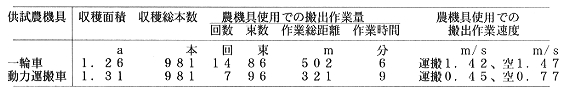 A圃場からトラックまでの距離が25m以内で、1日の収穫本数が1,000 本程度の場合、一輪車使用と動力運搬車使用の比較では、作業総距離と搬出作業速度は異なるものの総作業時間はいずれも約60分で、搬出積み込みの作業能率には差がみられない(表2)。