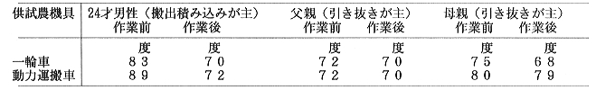 B労働負担の程度を示す作業前後の腰椎可動角度の差及び作業時の心拍数増加の程度は、一輪車使用と動力運搬車使用の比較では差がない(表3、4)。