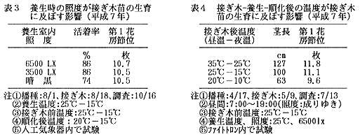 A接ぎ木苗の養生条件としては、温度は明期25℃〜30℃、暗期15℃〜20℃、照度は3500lxが接ぎ木苗の活着率を高く維持できる(表2、3)。