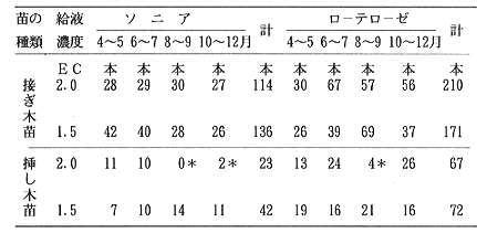 A2年生株の採花本数は挿し木苗と比較して接ぎ木苗が多く周年の給液濃度はEC2.0mS/cmがよい。しかし、「ソニア」の4〜7月出しには給液濃度が1.5mS/cm、「ロ−テロ−ゼ」の6〜9月出しには2.0mS/cmが適当であるなど、品種によって養液管理を変える必要がある(表2)。