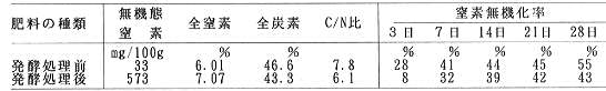 表1 有機物混合肥料の発酵処理前後の窒素形態およびビン培養法による窒素無機化率(平成5年)