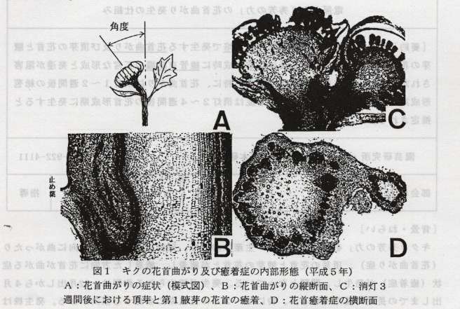 @キクの花首曲がりは、そのほとんどが止め葉(柳葉を含む)の着生する方向に曲がっている。花首の内部形態では、止め葉側の維管束組織にねじれや亀裂が生じており、それに伴って皮層細胞の伸長が妨げられているのが観察される。このことから、花首曲がりは、消灯後における花首維管束組織の正常な形成と発達が阻害されたことにより発生する症状である(図1A,B)。