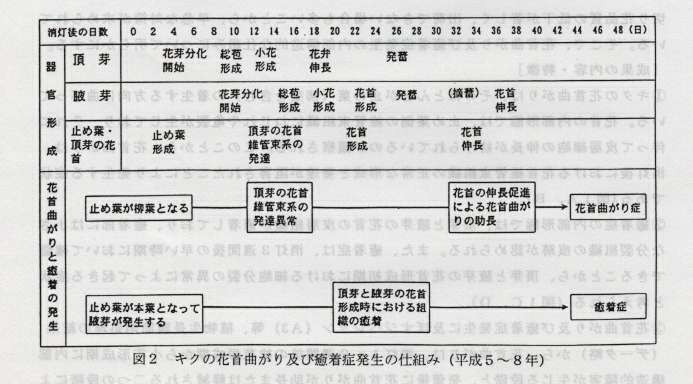 B花首曲がり及び癒着症発生に及ぼすジベレリン(A3)等、植物生長調節剤処理の結果(データ略)から、花首曲がりは、消灯1〜2週間後の総苞形成期から小花形成期に内部構造的障害が生じる段階と、発蕾後に花首曲がりが助長または軽減される二つの段階によって決定される。また癒着症は、消灯2〜4週間後に発生すると推定される(図2)。