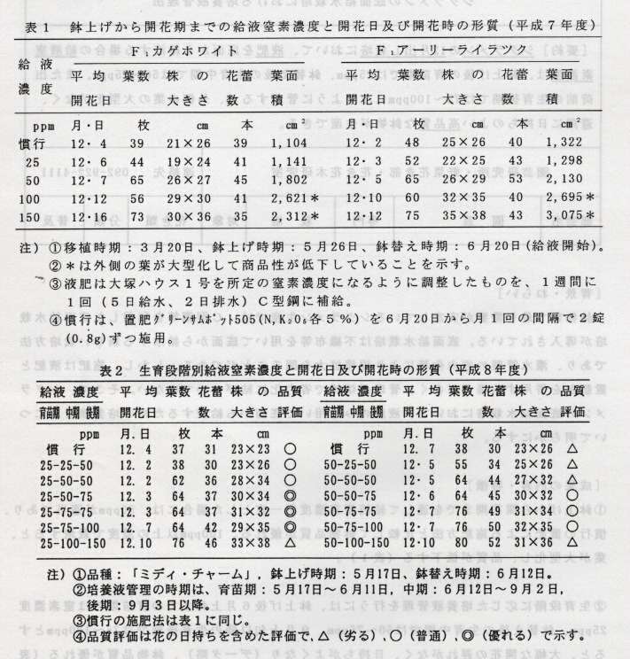 A生育段階に応じた培養液管理を行うには、鉢上げ後6月上旬までの育苗期では窒素濃度25ppm、鉢替え後の生育中期では50〜75ppm、9月上旬以降の生育後期では75〜100ppmとすると、大幅な開花の遅れがなく、日持ちがよくなり(データ略)、鉢物品質が優れる(表2)。