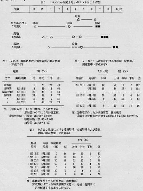 - 3 9月に出荷するためには、2月中旬に播種し、5月中旬から6月上旬に露地に定植する。また、1月中旬に播種し、4月中旬から8℃で30日間冷蔵した後、5月中旬に定植すると、9月上中旬の開花茎率が高くなる(表1,4)。