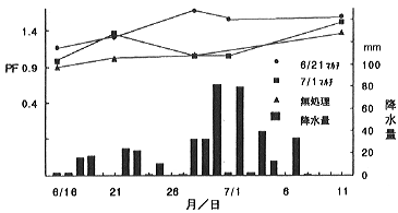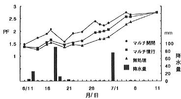 図1 少雨年(平成6年)の降水量とマルチ処理           図2 多雨年(平成5年)の降水量とマルチ処理