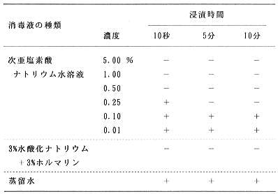 @ウイロイドに汚染された器具の消毒は、濃度0.5%の次亜塩素酸ナトリウム水溶液に10秒間浸漬することで可能である。また、従来からウイルス病の器具伝染防止対策として行っている、3%水酸化ナトリウムと3%ホルマリンの混合液に浸漬することでも可能である(表1)。