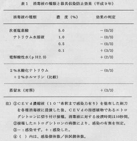 - 2 病院内における各種疾病の伝染防止に用いられる電解酸性イオン水は、ウイロイド汚染器具の消毒効果は認められない(表1)。