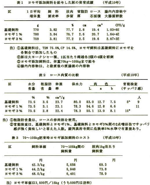生体重70kg以降の豚に、ヨモギを1〜3%添加した飼料を給与すると、背脂肪厚、赤肉中粗塩b含量及び腸内内容物中の大腸菌群数が低くなる傾向がみられる。}肉 1kg当たりの飼料費はヨモギ1%添加では4.8円高くなり、3%添加では9.6円高くなる。