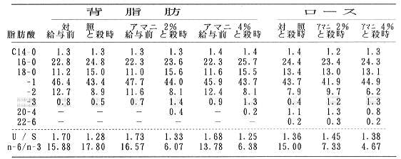 n-3系列脂肪酸が増えるので n-6/ n-3比が低くなる。特にα−リノレン酸(C18-3)は背脂肪ロースともに移行し,背脂肪とロースで約