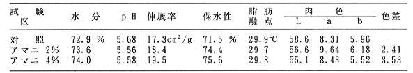 B豚肉の理化学的性状ではほとんど差がないが、アマニ油けん化物を給与量すると肉の色差は異なる傾向にあり、感知可能である(表3)。