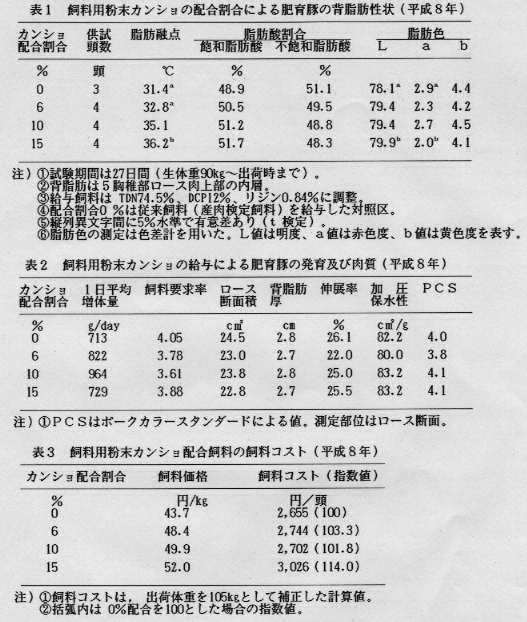 [背景・ねらい]豚肉については、全国各地において、特徴のある品種、系統、飼料等を利用して肉質に特長を持つ銘柄豚肉の生産がなされている。豚肉の肉質は、赤肉と共に脂肪の性状にも大きく左右され、カンショ等の炭水化物を給与することによって硬い脂肪、しまりの良い肉になると言われている。そこで、飼料用粉末カンショ(カンショ)を利用して、脂肪に特長を持つ豚肉生産技術を確立する。
