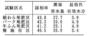 @堆肥の施用による土壌物理性改善効果は、牛ふん堆肥≧バーク堆肥>稲わら堆肥の順である(表1)。