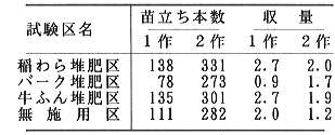 D牛ふん堆肥では1年に1回10t/10a施用することにより収量が増加するが、15t〜30t/10a施用すると初作目に収量が減少する(表4、表5)。