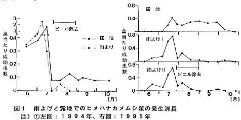 @雨よけ栽培には露地栽培と同様に土着天敵のヒメハナカメムシ類が発生する。また、盛夏期のビニル除去はヒメハナカメムシ類の発生様相に影響を与えない(図省略)。