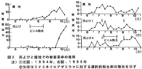 A雨よけ栽培では盛夏期にビニルを除去すると、ビニル再被覆後にミナミキイロアザミウマによる被害が露地に比べると増加する。しかし、ビニル再被覆後に殺虫剤散布することにより、被害果率を約10%に抑制できる(図省略)。